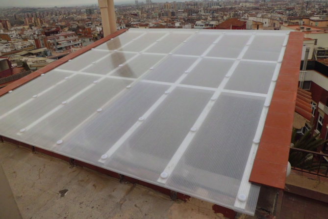 Instal·lació de plaques de polocarbonat cel·lilar, fixes a una estructura metàl·lica mitjançant perfils i cargols.
